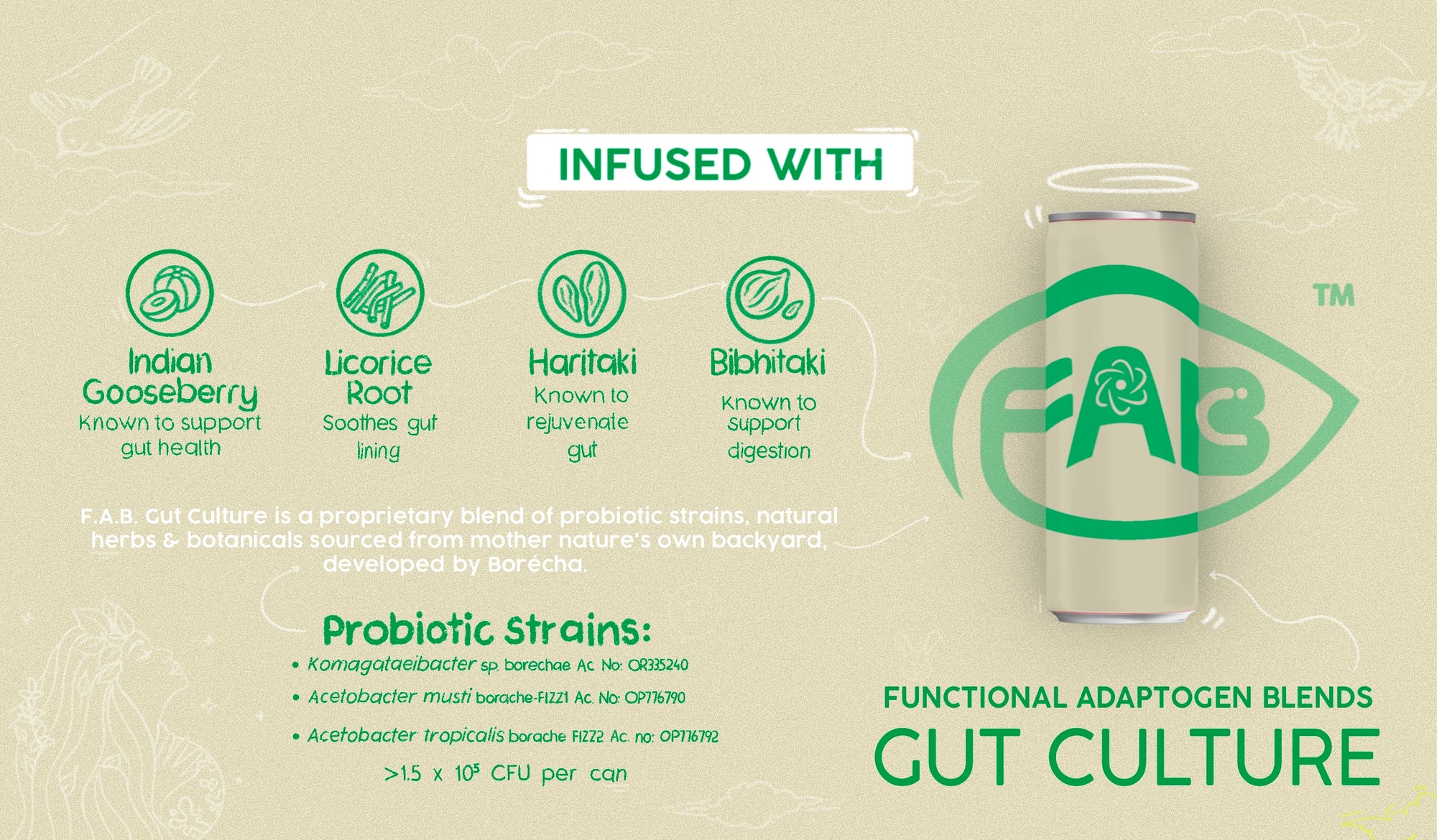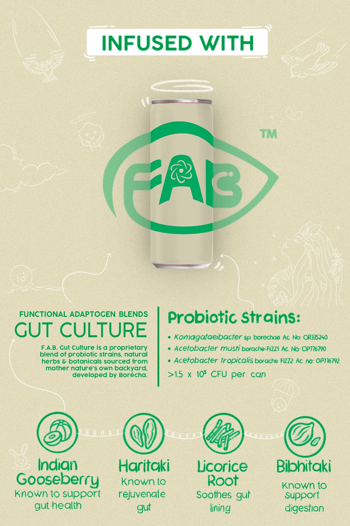 Kombucha (Water, Live Probiotic Kombucha Culture (Komagataeibacter sp., A. musti, A. tropicalis), Cane Sugar, Assam Black Tea, Darjeeling Black Tea), Natural Flavouring Substances (Lemon & Lime), Indian Gooseberry, Bibhitak, Haritaki, Licorice Root, Carbon Dioxide (INS 290)