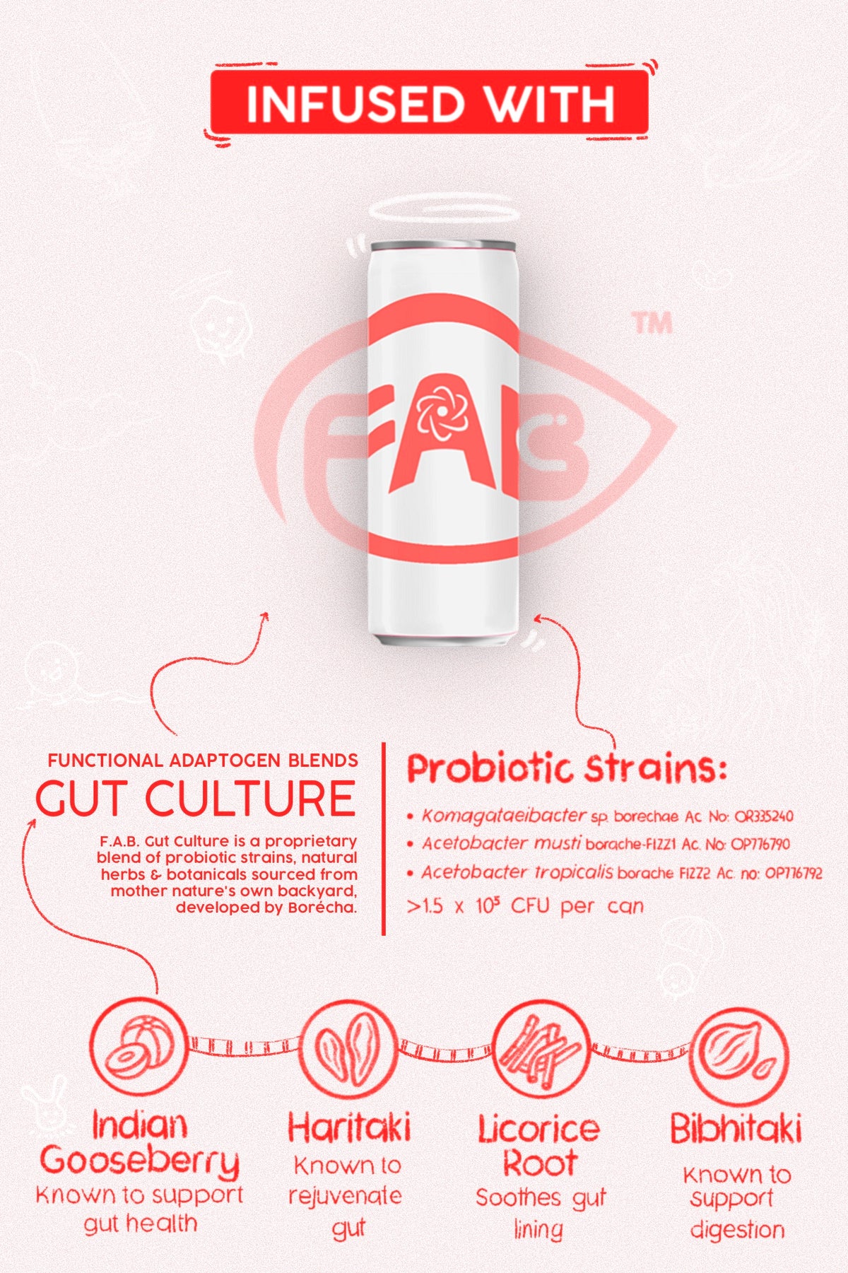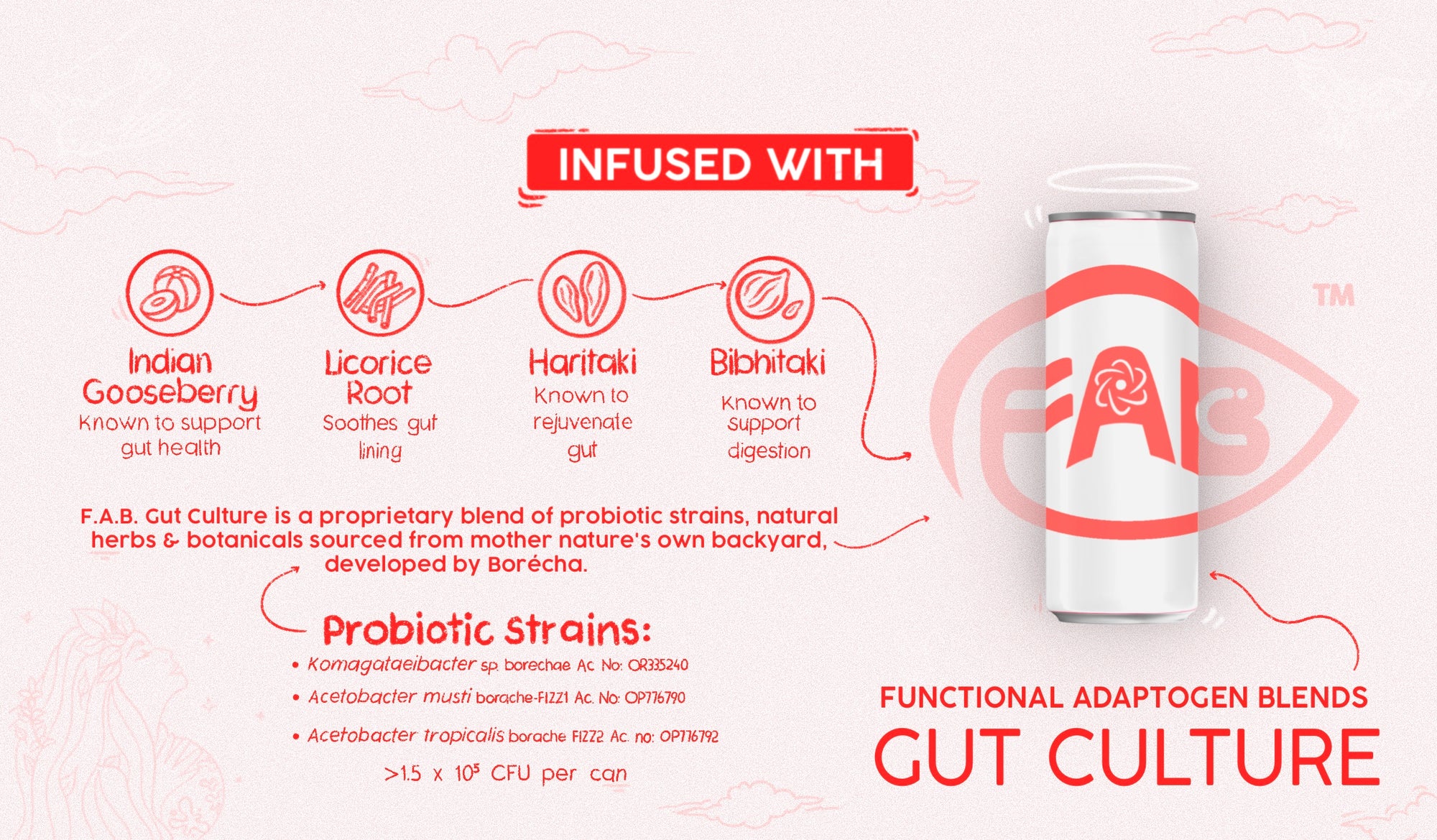 Kombucha (Water, Live Probiotic Kombucha Culture (Komagataeibacter sp., A. musti, A. tropicalis), Cane Sugar, Assam Black Tea, Darjeeling Black Tea), Natural Flavouring Substances (Rose & Lotchi), Indian Gooseberry, Bibhitak, Haritaki, Licorice Root, Carbon Dioxide (INS 290)